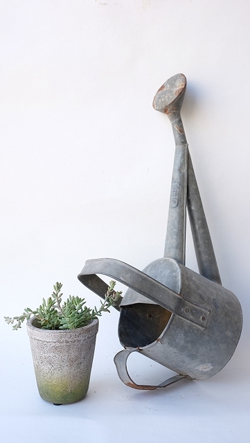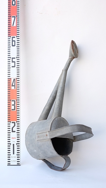 ディスプレイ用のブリキ如雨露です。実用はできません。所々にサビが見られますがオブジェとしてなら問題なく飾れます。こちらの如雨露は上部に持ち手があります。