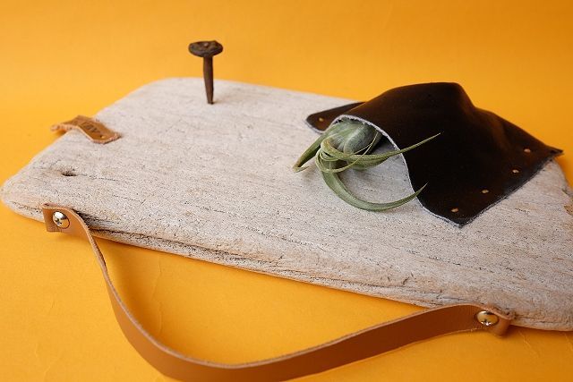 シャビーな板流木に牛皮をアレンジして壁面装飾オブジェを製作しました。ポケット部分には鍵や小物、エアープランツ等を飾ることができます。
