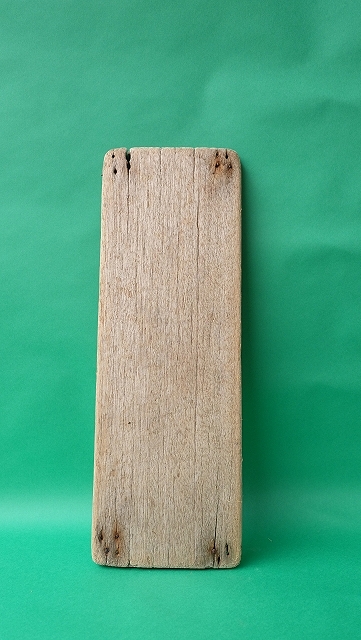 固く、しっかりとした素材です。表皮はシャビー感がありますが滑らかで美しいです。裏面には溝が彫ってあります。一部に錆びた釘が残存しています。