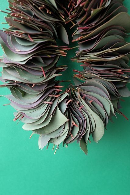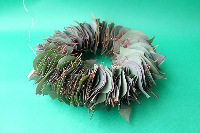 当農場でデコール用に栽培したユーカリポポラスのリーフをたっぷり使ってリースを製作しました。コロンとした可愛らしいフォルムが印象的です。完全にベージュに変色してからも存在感のある美しい葉です。