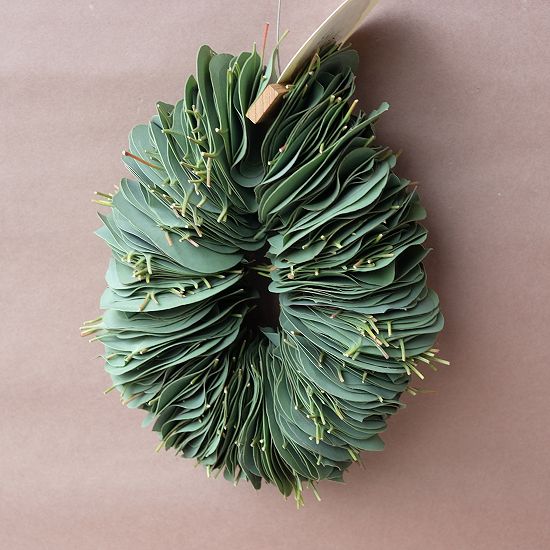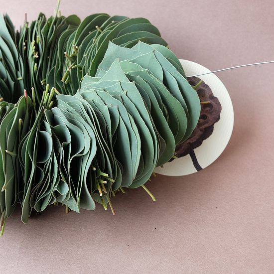 当農場でデコール用に栽培したユーカリポポラスのリーフをたっぷり使ってリースを製作しました。コロンとした可愛らしいフォルムが印象的です。完全にベージュに変色してからも存在感のある美しい葉です。