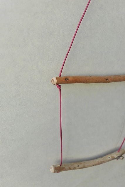 棒流木と皮ひもを使って製作しています。