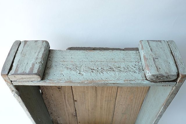 板流木で作った定番のトロ箱にアンティーク塗装を施したものです。こちらは草色でポップな塗料を使い四隅に添え木を付けてアクセントを持たせました。程よいシャビー感と味わいのある大人の雑貨です。