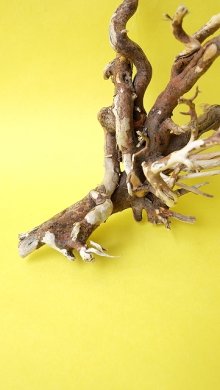 固く、しっかりとした素材です。硬質でくねくねと根の特徴が顕著な材で密度が高く美しい材です。斑になった表皮も美しいです。インテリア・オブジェとしてお勧めします。