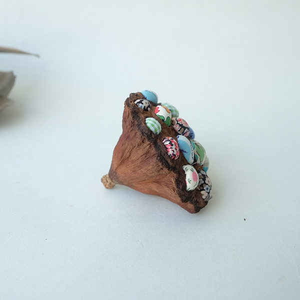 当農場の蓮の花托のハチス部分に綿花を布で包んだ詰め物を施してオブジェを製作しました。布は全てリバティプリントを使用しています。