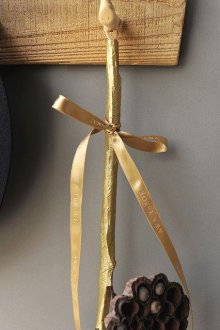 当農場でデコール用に栽培した蓮の乾燥花托で阿波遊木オリジナルリースを製作しました。少し丈の長いタイプで花托、ユリ共に大きなサイズを使用しています。